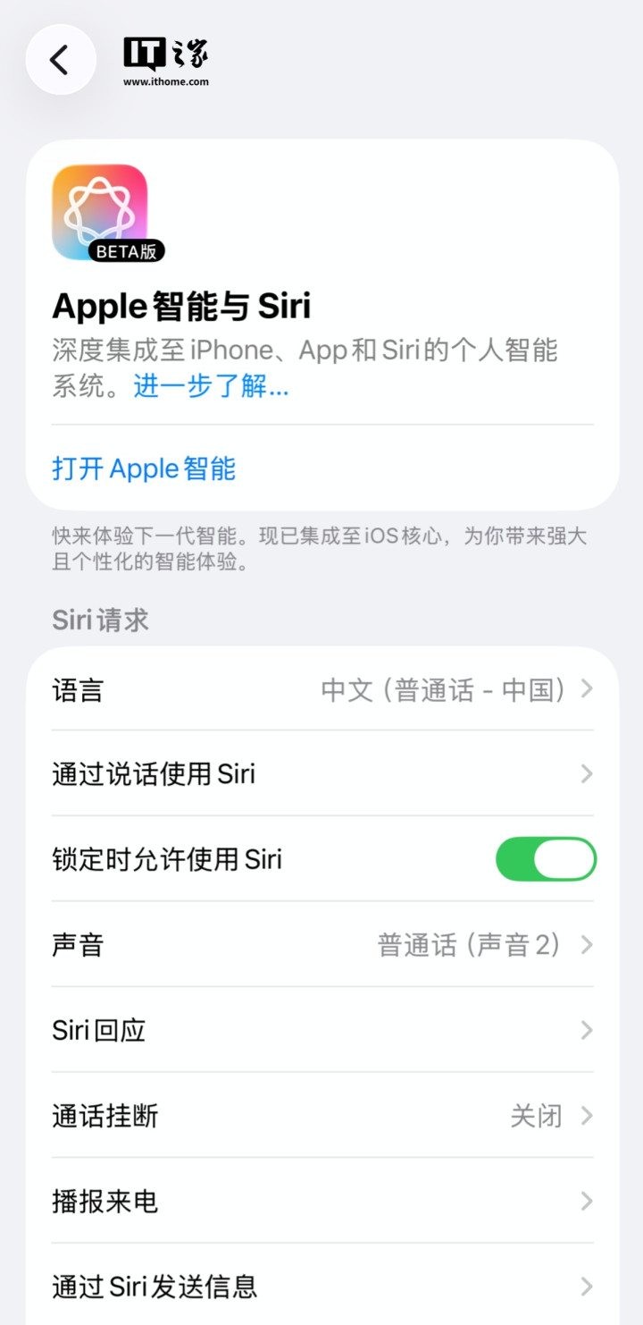 IT之家3月31日消息,今天凌晨,苹果突然在国行iPhone手机上线Apple智能(AppleIntelligence),当时只需要更新到iOS26.4及以上系统,就能在设置页面看到原有的“Siri”设置将被替换成“Apple智能与Siri”,并可以下载Apple智能模型(大小约9.5GB左右)。